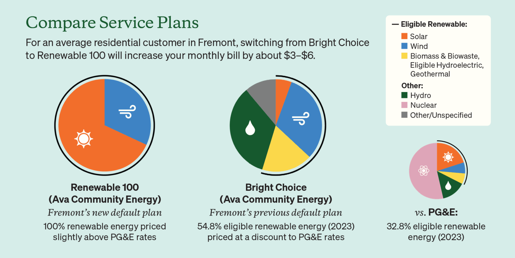 All of Ava’s member jurisdictions have the power to choose which service plan becomes the default for their residential, commercial, and municipal accounts. Fremont and other cities like it opt for Renewable 100 to minimize their carbon emissions. Other communities choose Bright Choice, Ava’s lower-cost plan. Both decisions reflect elected officials prioritizing what their communities need most, and highlight the foundational benefit of community choice energy: providing customers with options for where their power comes from and the rates they pay for it.